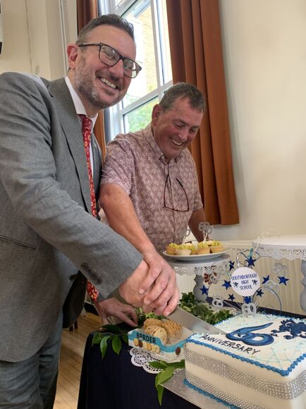 After delivering a brief address to all our visitors, Headteacher Mr Smith invited ex-Headteacher Mr Rook to cut the celebratory cake with him. Other ex-members of staff who joined us for the afternoon included ex-Deputy Headteacher Mr O’Toole , ex-Assistant Headteacher Mr Armstrong and ex-P.A to a number of SHS Headteachers, Mrs O’Toole. It was lovely to see them back at Southborough!